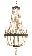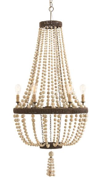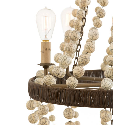 has three sizes of ivory-colored stained crackle resin beads. The hand-wrapped antique brass wire frame anchors the swags and the beaded tassel completes the look. Elegant and neutral, it goes anywhere in the house. Additional chain available CHN-942.