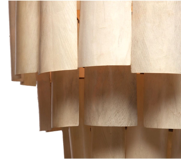 This contemporary yet formal shape is made of banana bark set in resin. The semi-opaque leaves create a dramatic pattern of light.