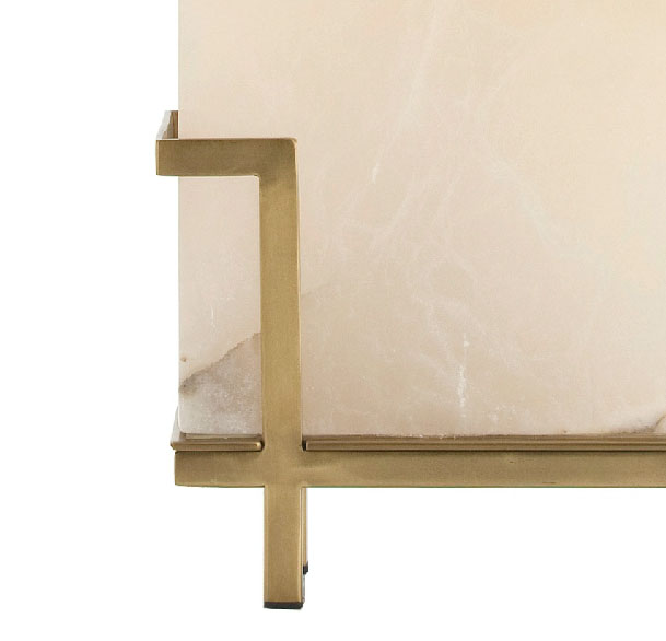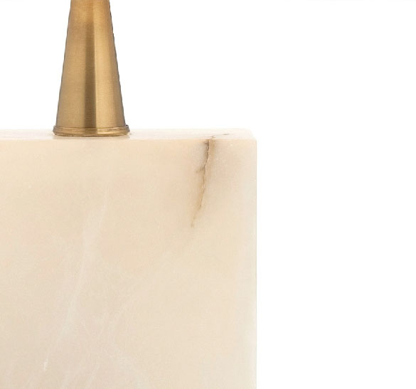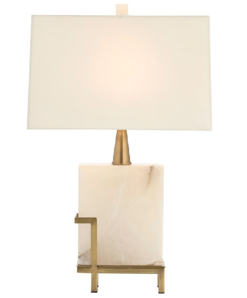 Rectangular snow marble table lamp sits on an elevated vintage brass pedestal. Topped with a rectangular ivory shade with cream cotton lining.