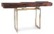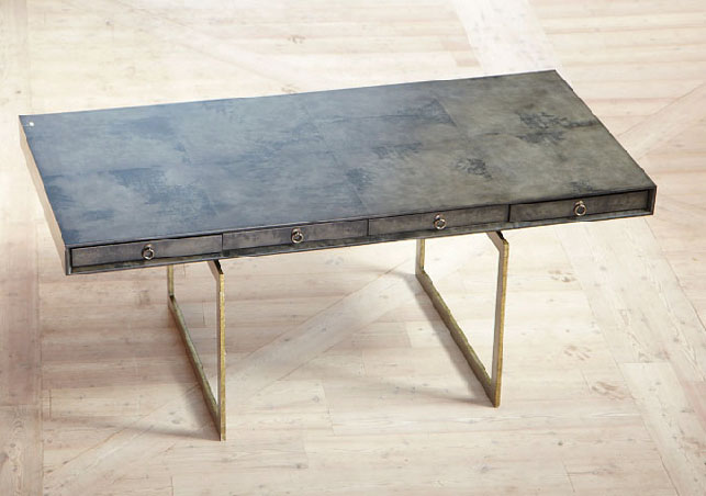 A large stylish desk inspired by a Danish design from the 1950's. A luxurious desk whose top is wrapped in vellum, has sycamore-lined drawers and steel metal legs have gilded. Vellum is natural sheep skin and is each unique in color variations and texture. Care should be taken as with any other natural leather or hide.