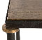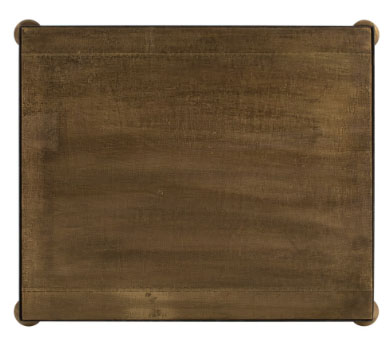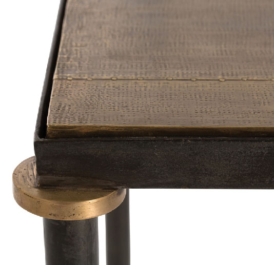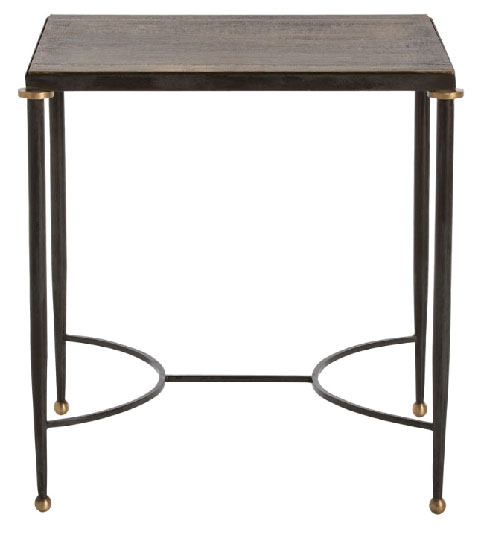 A transitional design gets updated with current materials and finishes, natural iron legs with brass accented feet and a square antique brass clad top.