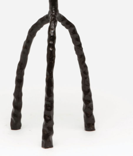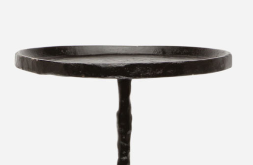 Notched iron gives texture to this simple tri-pod silhouette. Rimmed top make it ideal for setting you glass down.